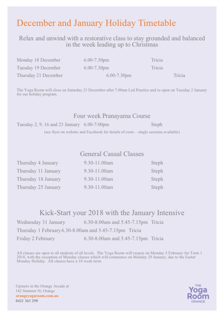 Above is the timetable for our December/January Holiday Program. Please join us over the Christmas and New Year break to stay calm, grounded and energised.